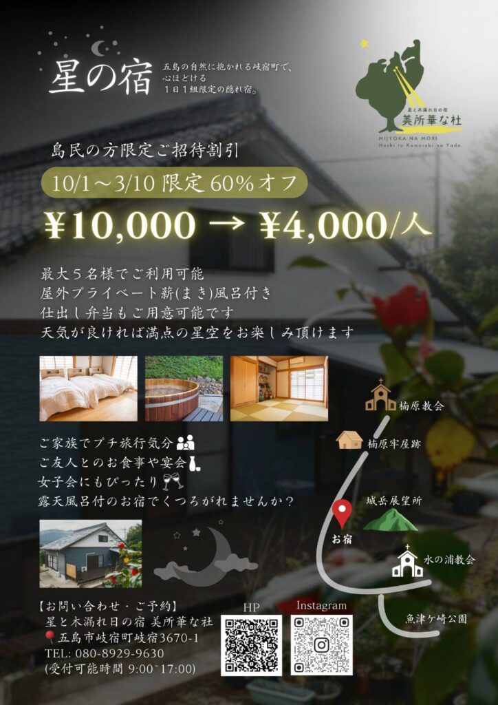 当施設では、よりお手頃な価格でお客様に滞在を楽しんで頂くために、冬割キャンペーン(11月10日~3月10日)を開始しました。この機会にぜひ、五島での心温まるお時間を当施設でお楽しみください。 -